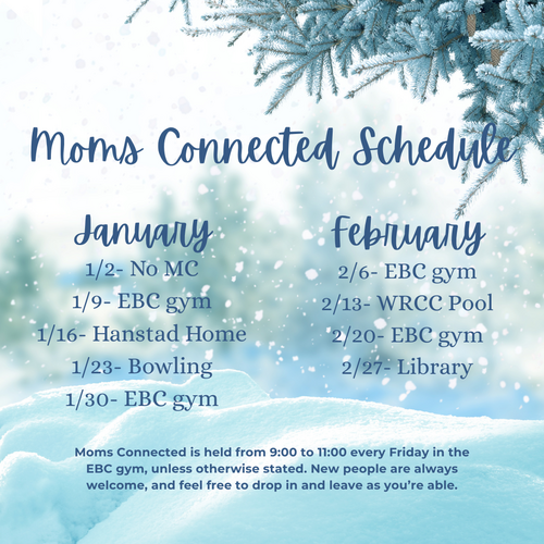 Moms Connected is held from 9:00 to 11:00 every Friday in the EBC gym, unless otherwise stated. New people are always welcome, and feel free to drop in and leave as you’re able.
