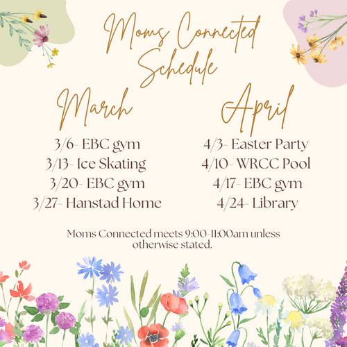 Request to join the EBC Moms Connected Facebook group to get updates on playgroup locations, join the Moms Connected group on the EBC app, or view the schedule at the Connection Center.